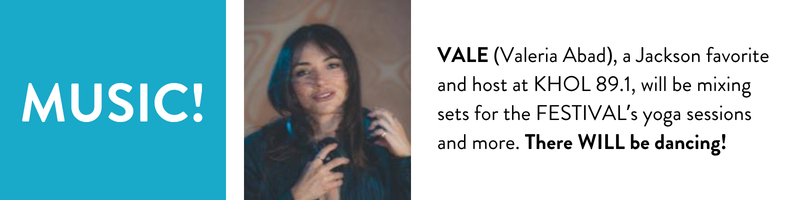 VALE (Valeria Abad) honed her craft in New York and Los Angeles before arriving in Jackson in 2017. Widely acclaimed for her eclectic repertoire—including iconic salsa music she first heard from her dad's vinyl collection, in her native Ecuador—Vale also serves the community as a Pilates instructor, Spanish tutor and certified interpreter. LISTEN to this sample set from KHOL (89.1), where she is a regular show host. VALE will provide the soundtrack to this year's FESTIVAL, accompanying our yoga sessions, DANCING, and more.