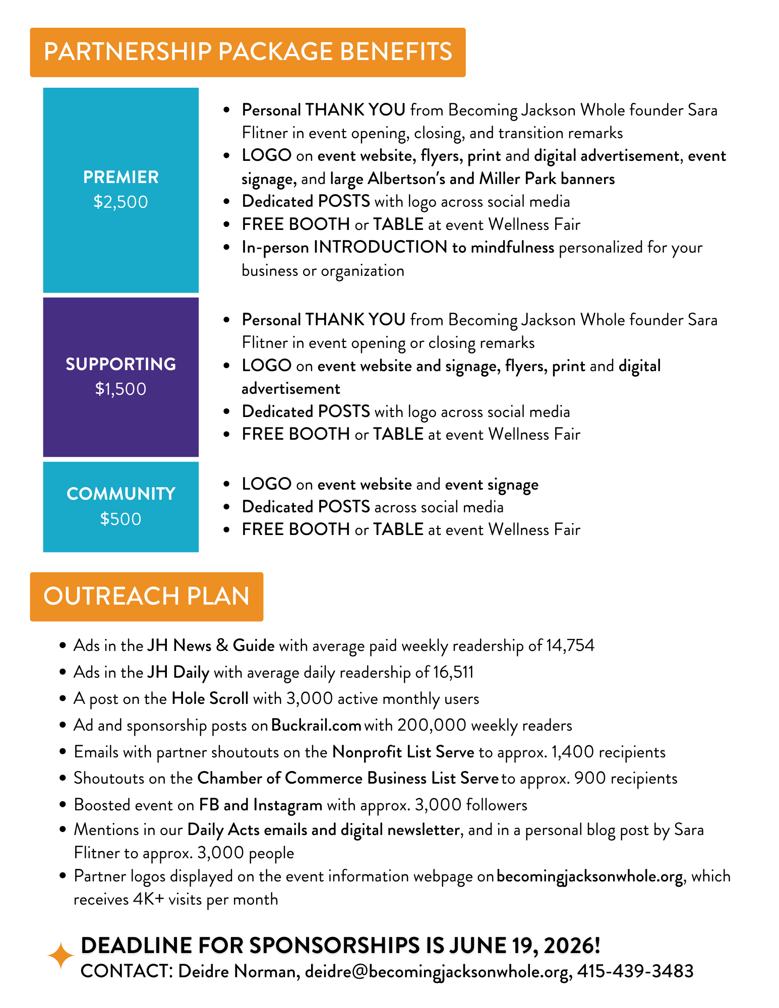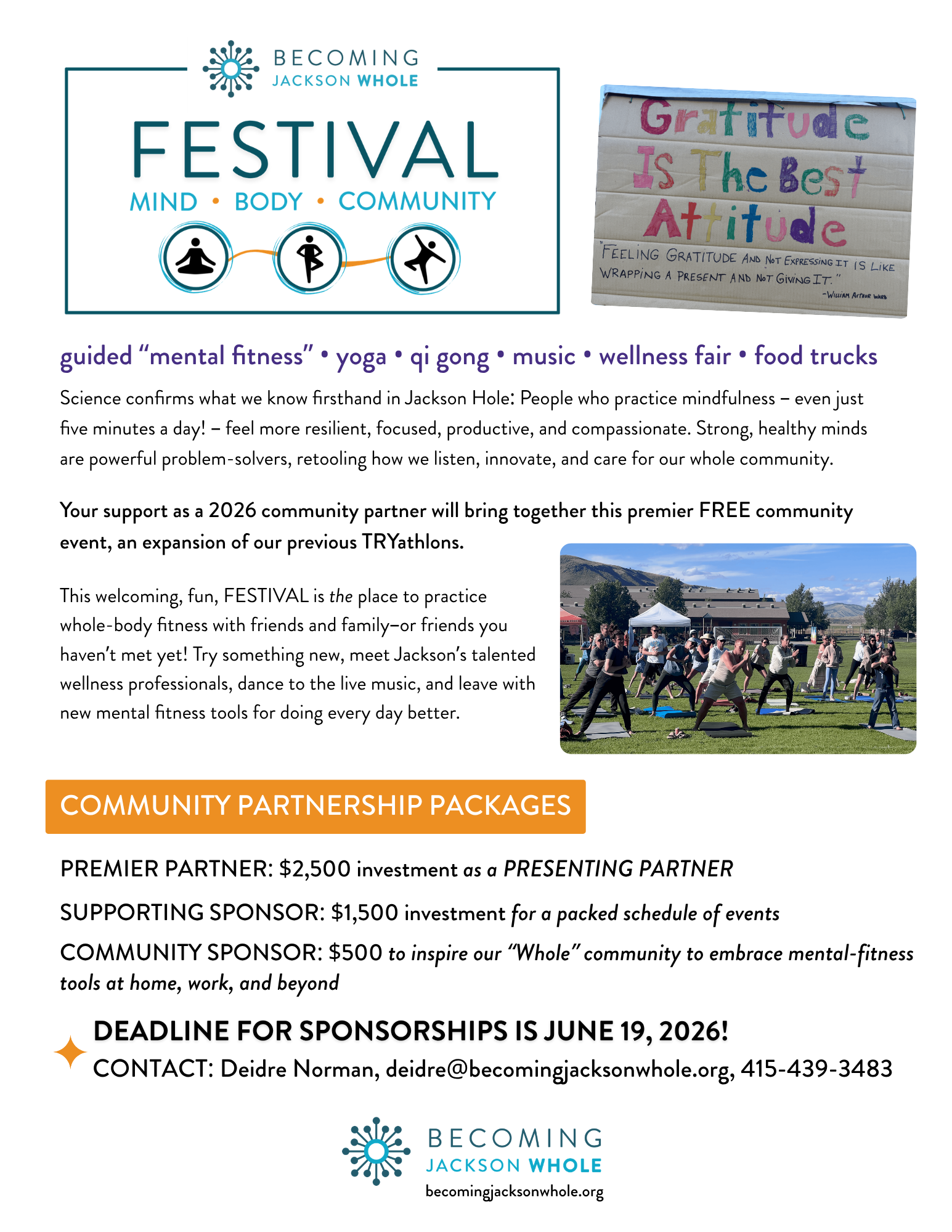 Becoming Jackson Whole founder and mindfulness trainer SARA FLITNER will lead guided mindfulness practice welcoming of all levels of experience, from first-timers to seasoned practitioners. “If you get one thing from this event, we hope it’s this: Understanding that mindfulness isn’t something else you have to do to feel better, it’s how you can do everything you're already doing with more focus, less stress, and more resilience.”